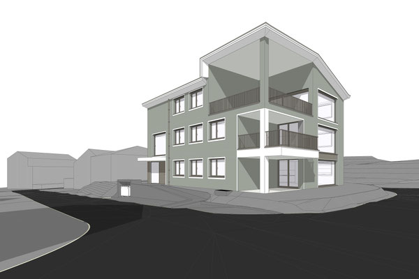 In einem ruhigen Wohnquartier entsteht ein Neubau eines Mehrfamilienhauses mit moderner Architektur und Steildach.